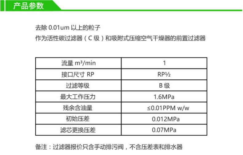 去除1um以上的粒子 残余含油量:≤1PPW w/w 作为B级精过滤器的前置过滤器 初始压差:0.01MPa 滤芯更换压差:0.07MPa